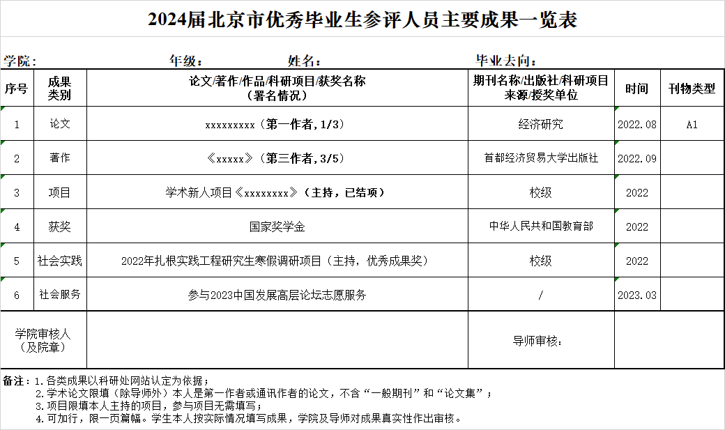 2. 《2024届北京市优秀毕业生参评人员主要成果一览表》(只做样式参考,需要系统导出)
