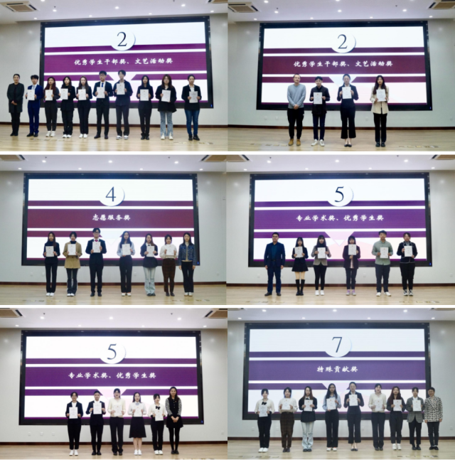 随后,学院党总支书记曾庆梅、党总支副书记王美慧、副院长高静、副院长李委明、办公室主任金湜、科研秘书许海潇分别为获得优秀学生干部奖、文艺活动优秀奖、志愿服务奖、专业学术奖、优秀学生奖、特殊贡献奖的同学们颁发荣誉证书。他们或积极参与学生工作、组织丰富多彩的活动;或潜心学业科研,参与课外学术竞赛;或投身志愿活动,勤于社会实践;或携笔从戎,誓要以己之力守护祖国岁月静好,都是八叉书库 学子们学习的榜样!