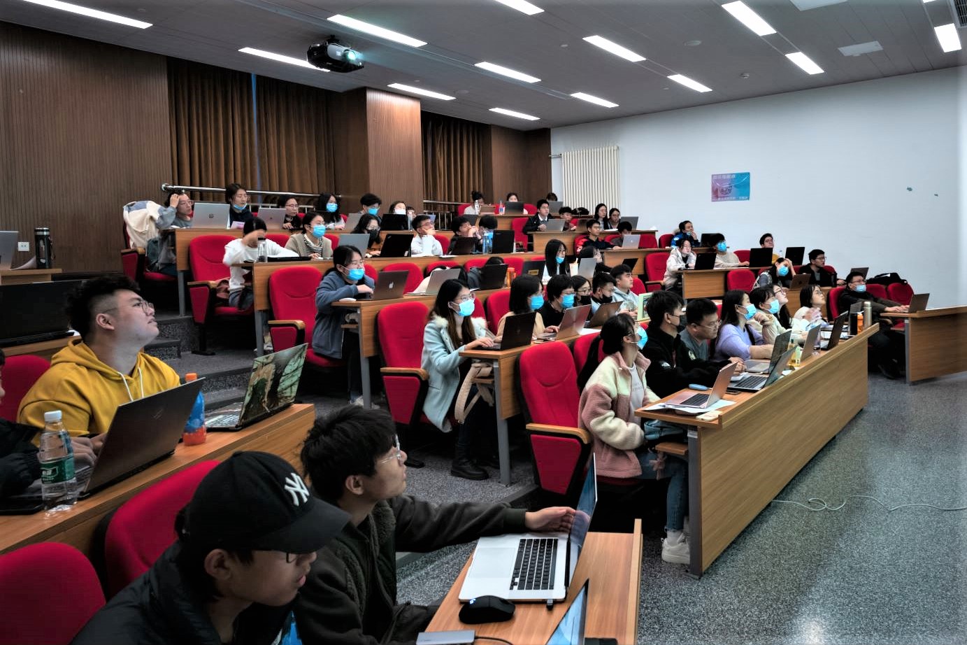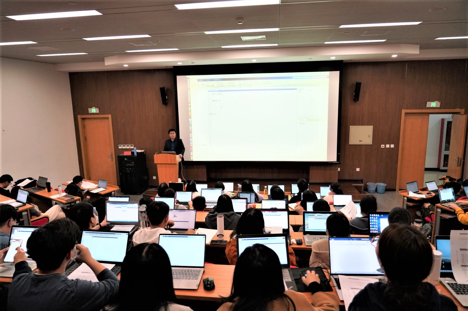 李委明副教授从Matlab界面功能等基础知识出发,向同学们展示了软件的基础操作,并介绍了Matlab软件基本底层逻辑。随后李老师实际操作演示如何应用软件进行矩阵的输入与计算法则,同时向学生分享了研究中常用的技巧与经验。此外,他还着重提醒同学易出错以及需要注意的关键句法表达。课堂现场气氛活跃,同学们认真边听课边实操,课后同老师进行了积极讨论。