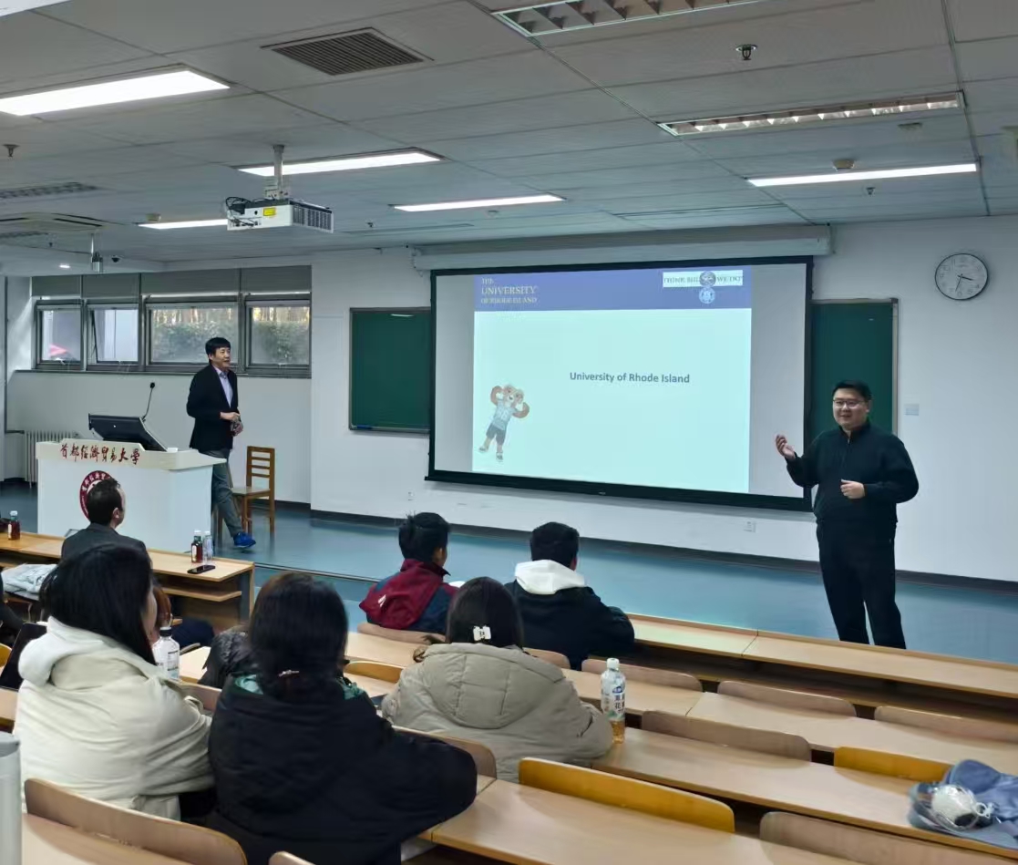 宣讲环节,林秉旋系统阐述了罗德岛大学的发展历程、学科建设特色及地理区位优势,并聚焦于“2.5+1.5”双学位项目展开详细解读。林秉旋着重强调,罗德岛大学拥有完善的教学体系与优质的教育资源,该项目以培养具备国际视野、跨文化沟通能力及扎实专业功底的复合型人才为核心目标。他表示,参与项目的学生不仅能深度体验美国高等教育教学模式,还可借助罗德岛大学广泛的校友资源,为未来职业发展及学术深造奠定坚实基础。