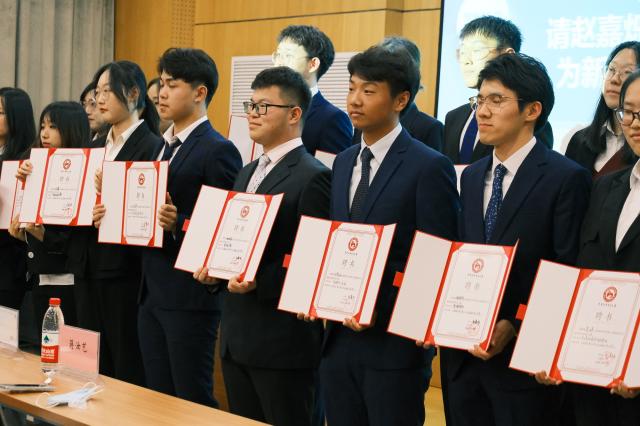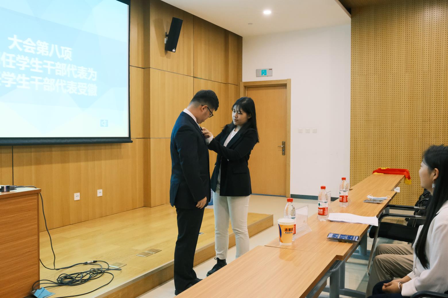 大会第二项,于滨滨、赵嘉烁为新任学生干部颁发证书并合影留念。